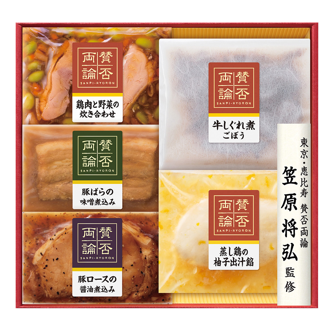 | 商品内容 | ●賛否両論(蒸し鶏の柚子出汁餡・鶏肉と野菜の炊き合わせ各150┣g┫、豚ロースの醤油煮込み・豚ばらの味噌煮込み各70┣g┫、牛しぐれ煮ごぼう55┣g┫) |
