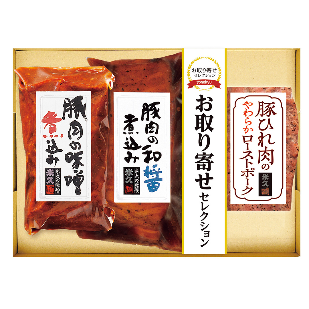 | 商品内容 | ●豚肉の味噌煮込み210┣g┫、豚肉の和醤煮込み210┣g┫、豚ひれ肉のやわらかローストポーク100┣g┫ |