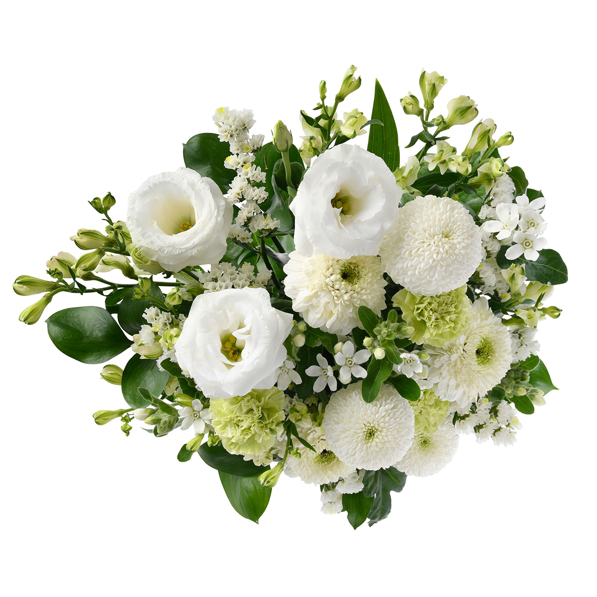 凛とした美しさを放つトルコギキョウ(花言葉:思いやり)、高貴で洗練されたピンポンマム(花言葉:真実)、そして前を向く力をくれる白いガーベラ(花言葉:希望)を必ずお入れし、心穏やかになる洗練されたグラデーションを作り出しました。