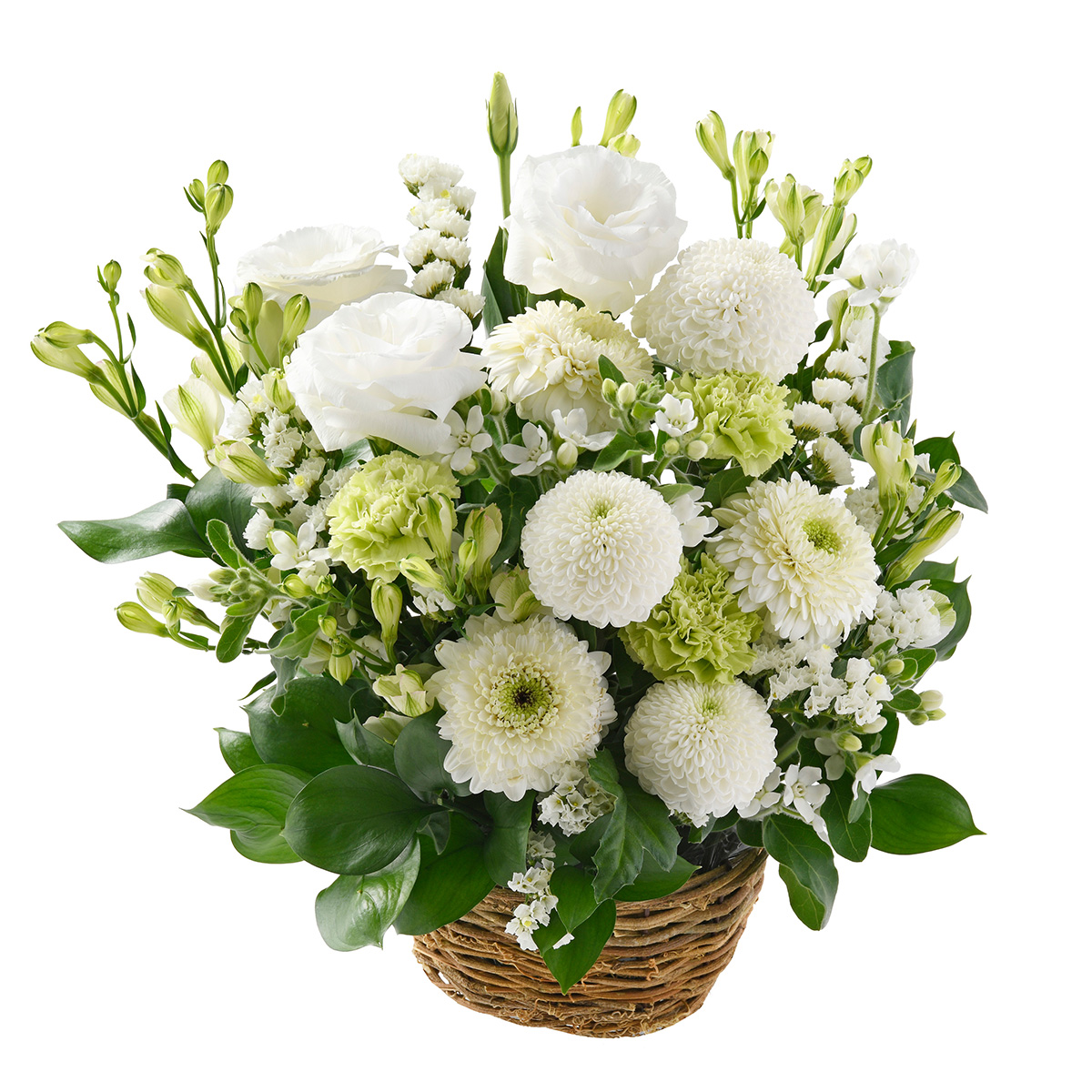 清らかで美しいホワイト系のお花をたっぷりと贅沢にあしらった、ボリューム感のあるLサイズのアレンジメントです。