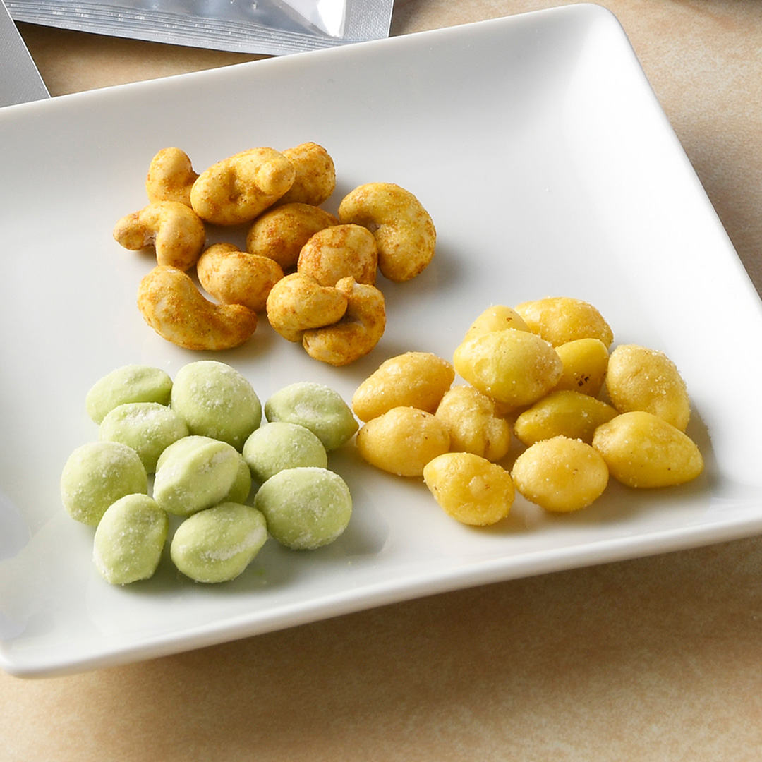 原材料(カレーカシューナッツ) | カシューナッツ(ベトナム産又はインド産)、小麦粉、寒梅粉ミックス、砂糖、食塩、カレーシーズニング、かつお節エキス、メープルシュガー/加工澱粉、調味料(アミノ酸等)、着色料(カロチノイド、ウコン)、香料、香辛料抽出物、リン酸Ca、酸味料、(一部に小麦・乳成分・大豆・鶏肉・豚肉・さば・カシューナッツを含む) |