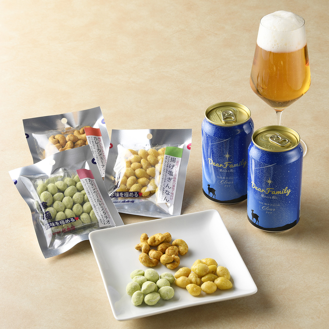 セット内容 | THE軽井沢ビール Dear Family 星のふる夜に(クリア) 350ml缶×各2 / 一杯の珍極(揚げ塩ぎんなん / カレーカシューナッツ / カマンベールピスタチオ)各1袋 |