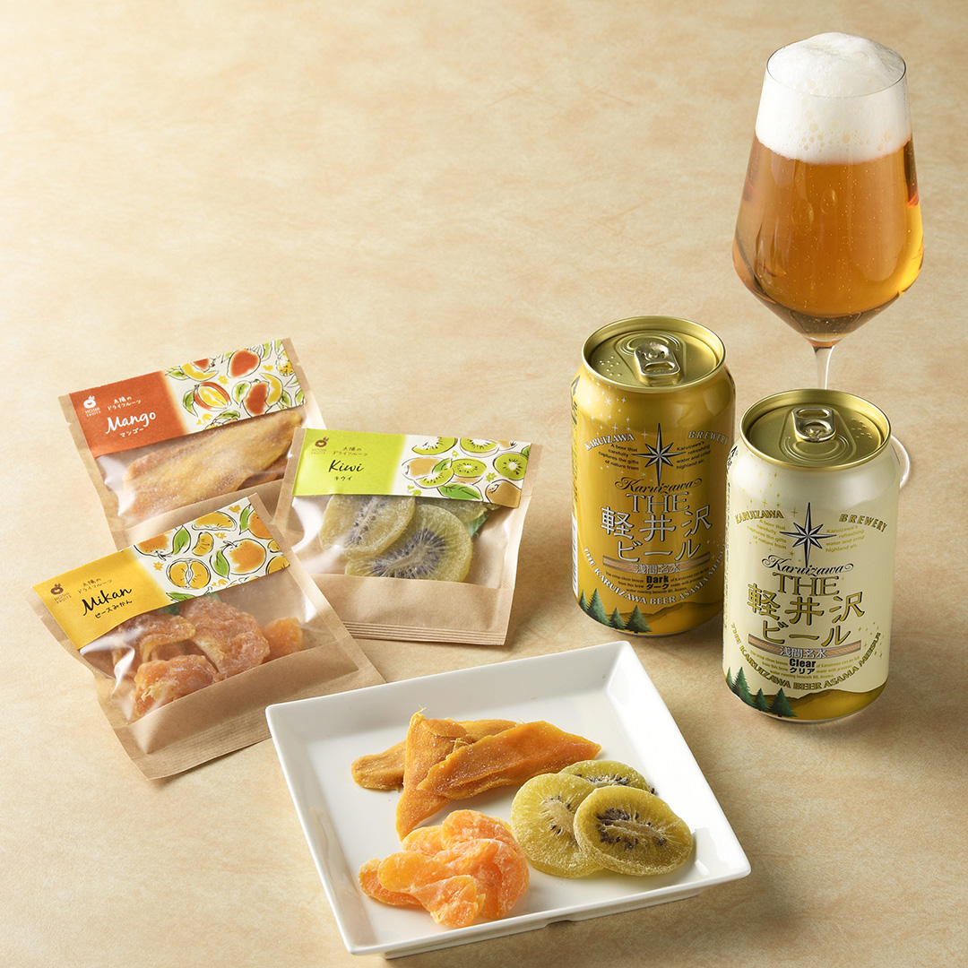 セット内容 | THE軽井沢ビール(クリア、ダーク) 350ml缶×各 / ホシフルーツ ドライフルーツ(みかんピース / キウイ / マンゴー)各1袋 |