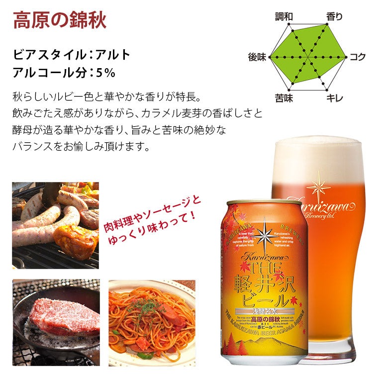 【秋限定】軽井沢ブルワリーの秋季限定「高原の錦秋(赤ビール)」は、秋らしいルビー色と華やかな香りが特長。飲みごたえ感がありながら、カラメル麦芽の香ばしさと酵母が造る華やかな香り、旨みと苦味の絶妙なバランスをお愉しみ頂けます。