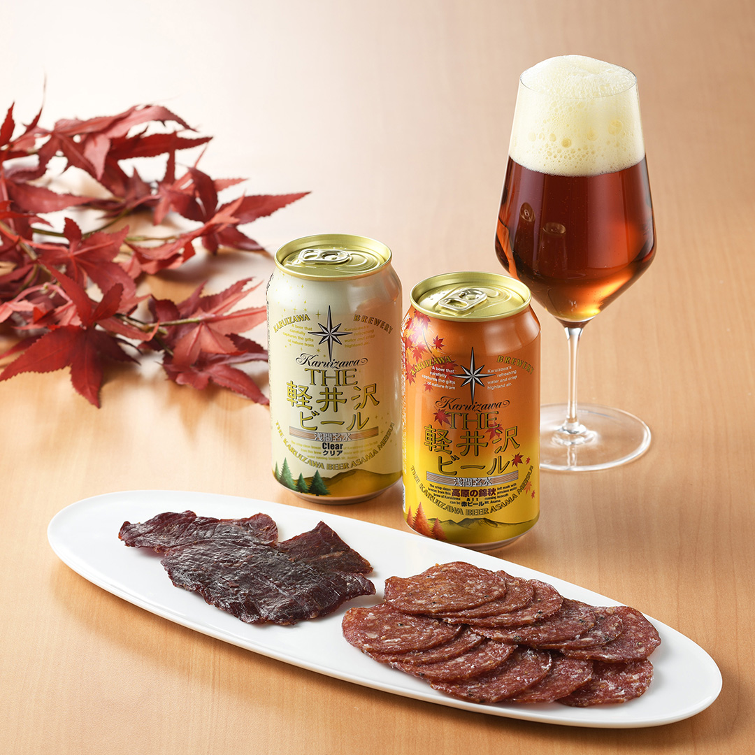セット内容 | THE軽井沢ビール(高原の錦秋、クリア) 350ml缶×各1 / ビーフジャーキー20g / おつまみサラミ(サラミソーセージ スライス) 40g |