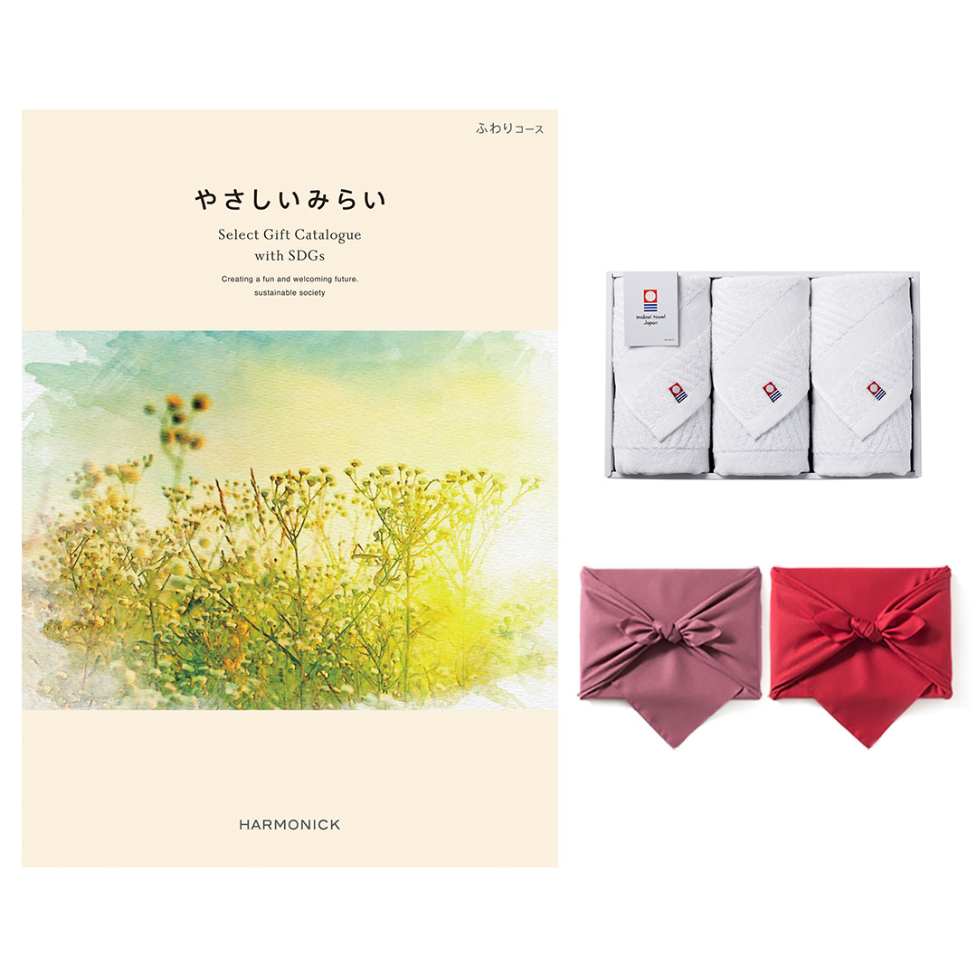 やさしいみらい カタログギフト(ふわりコース)+今治 綾 フェイスタオル3枚セット【風呂敷包み】