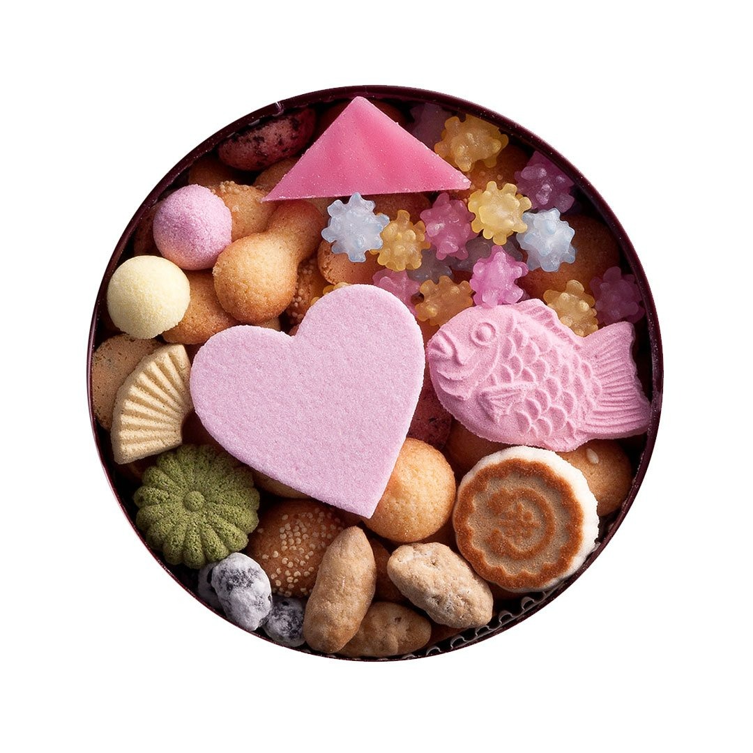 古来より茶事には欠かせないお菓子として親しまれている「吹きよせ」。 郷土菓子の素朴さを損なうことなくかたどり、上品に小型化しました。 しゃきっとした歯ざわり、自然の息吹きを思わせるような優しげな色合いと香ばしさは、 どなた様にもお楽しみいただける逸品です。バターを使用しない和風のクッキーに金平糖や和三盆、落雁、打ち物などの干菓子が缶に詰まった甘いお菓子です。縁起物(プラス1品)