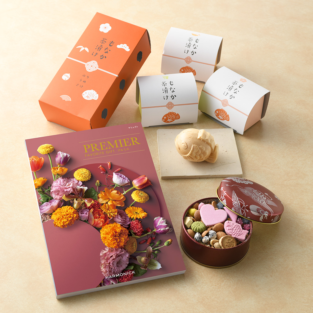 充実した商品が満載の総合カタログギフトをメインに、引き菓子に江戸和菓子の銀座菊廼舎の冨貴寄(ふきよせ)、そして「鯛」をモチーフにした最中が可愛いお茶漬けを縁起物にしました。