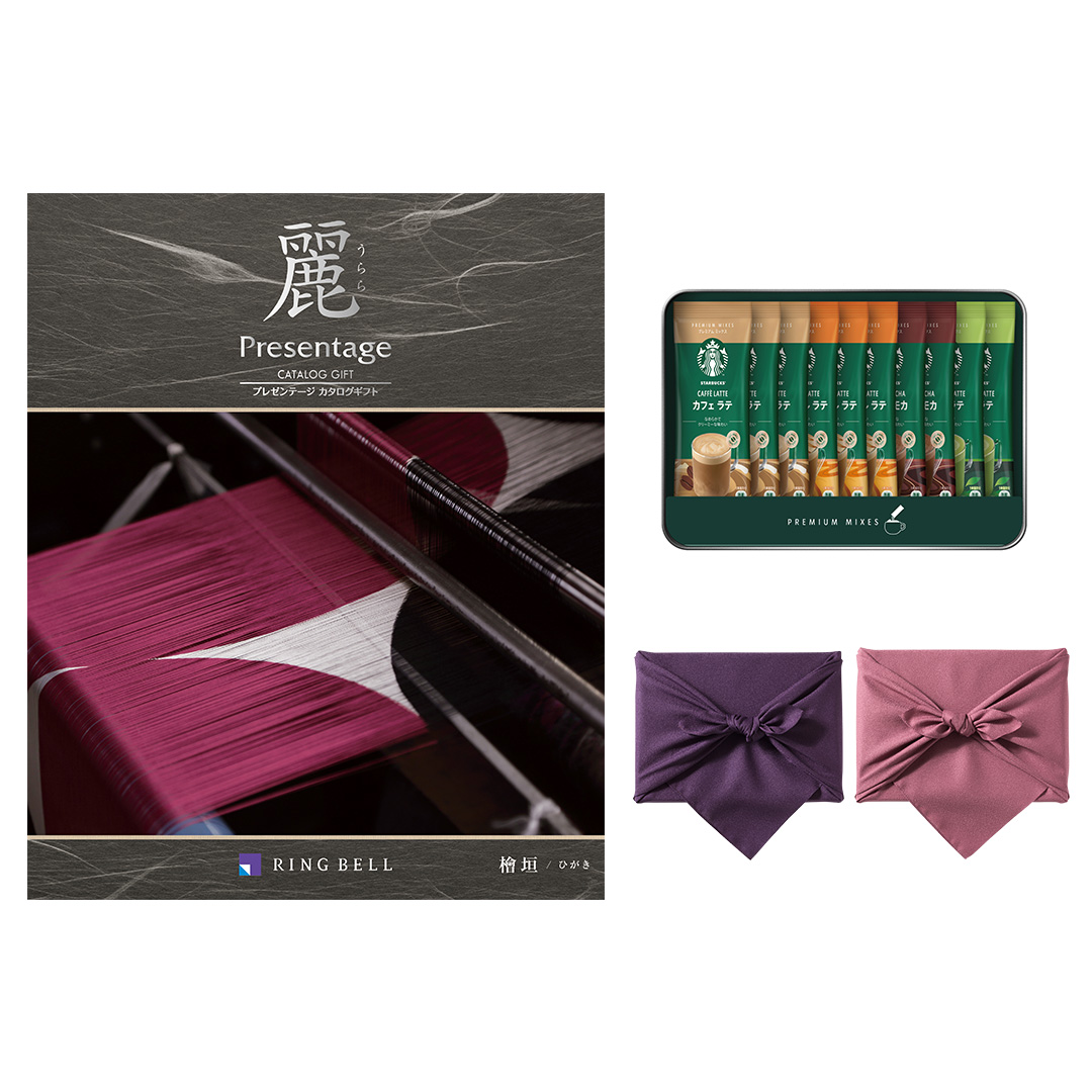 カタログギフト リンベル プレゼンテージ・麗(うらら) 〔檜垣(ひがき)〕+ スターバックス プレミアムミックスギフト(SBP-20B)【風呂敷包み】