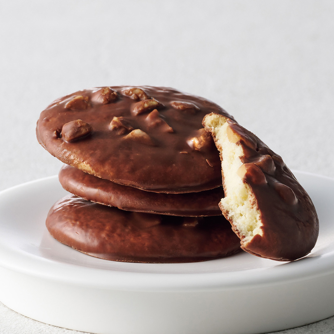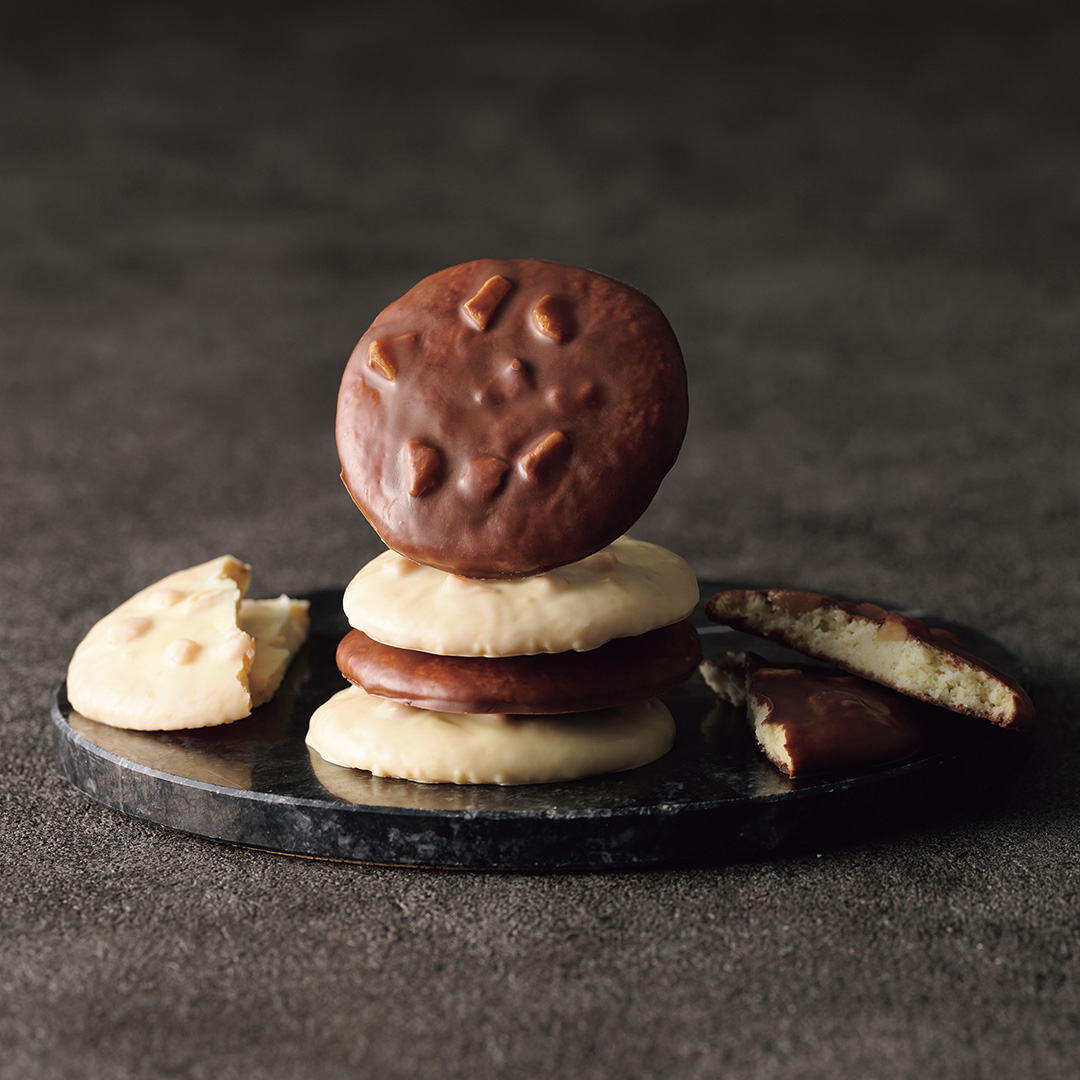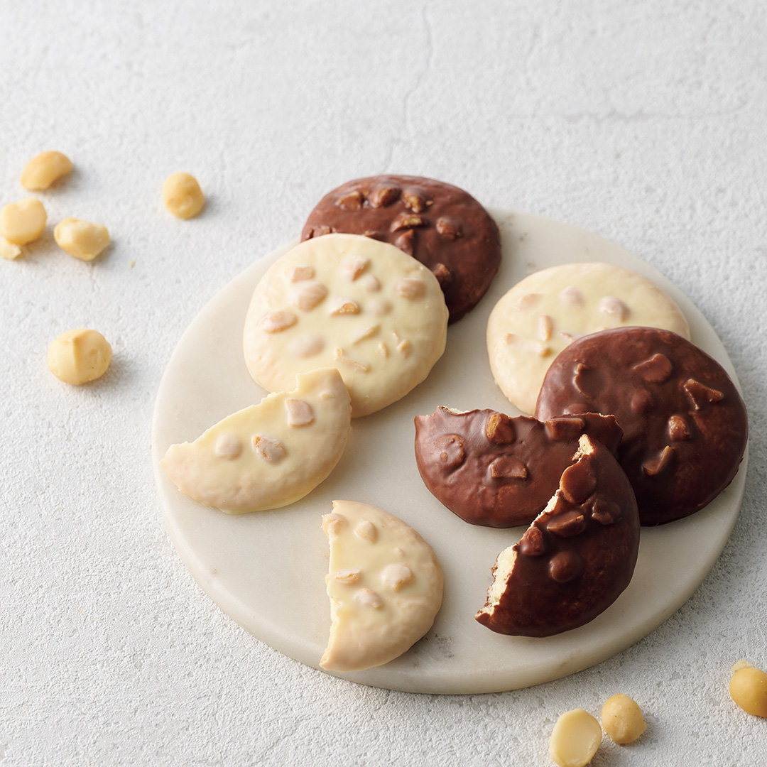 サクサクに焼き上げたサブレにマカダミアナッツをたっぷりのせて、なめらかなくちどけのチョコレートでコーティングしました。