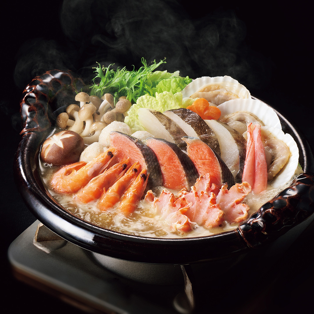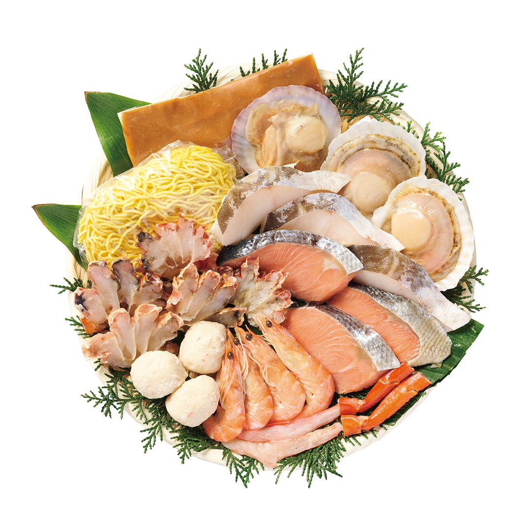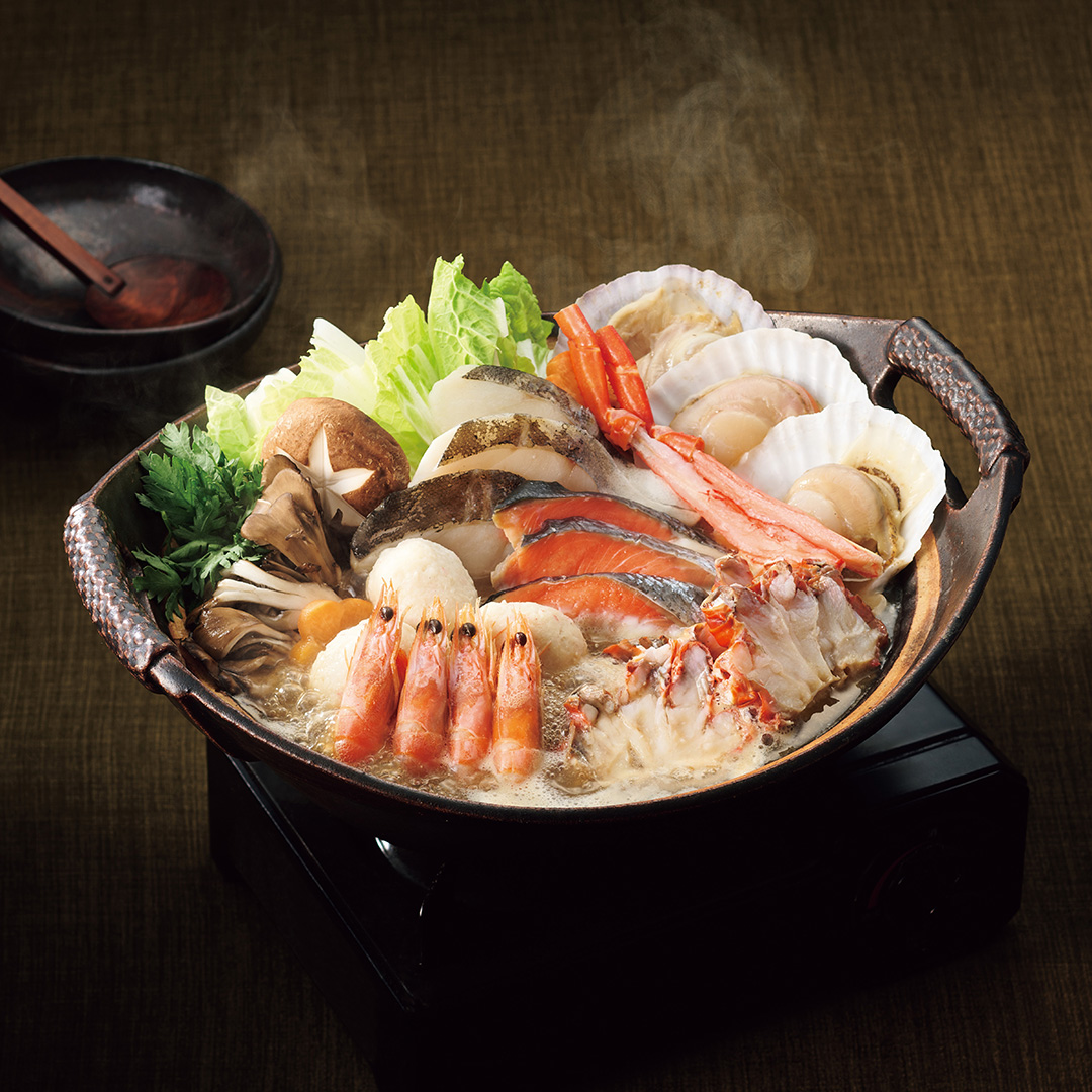 紅ずわいがにをはじめ、鮭、タラ、ホタテ、エビなど海の幸を多彩に盛り込んだ海鮮鍋のセット。