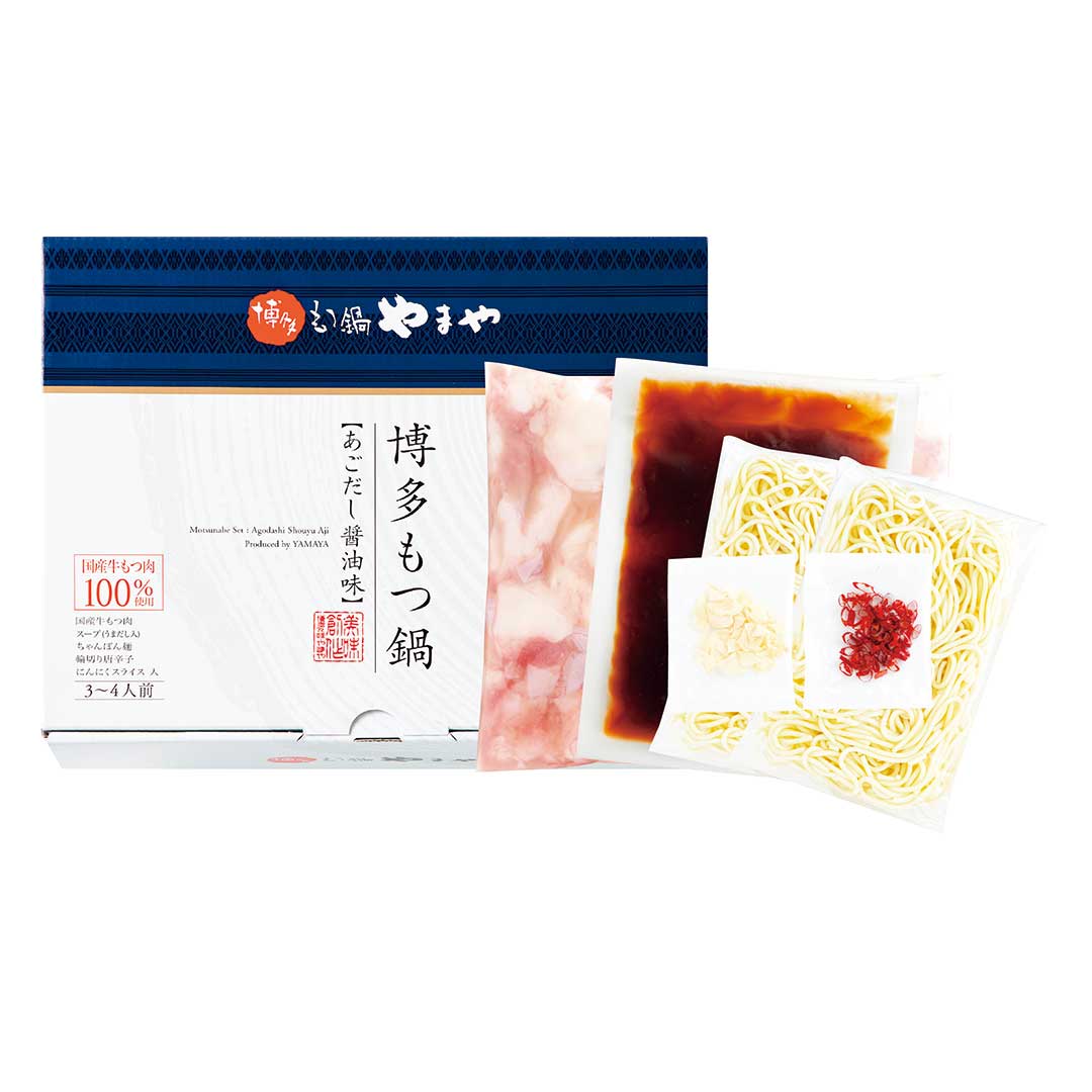 セット内容 | ●もつ鍋あごだし醤油味3-4人前【牛もつ(国産)400g、スープ(濃縮タイプ)200g、ちゃんぽん麺(ゆで)300g(150g×2)、にんにく2.5g、唐辛子0.5g】、無着色辛子明太子(切子込)150g(すけとうだらの卵:ロシア産) |