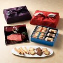 お肉好きの方へ贅沢な時間・体験が贈れるカタログギフトに、ヨックモックの詰合せを添えて、風呂敷にお包みします。