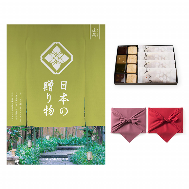 日本の贈り物 カタログギフト 抹茶(まっちゃ)+<KOGANEAN>【風呂敷包み】こがねもなか・こいねり・どら各4個
