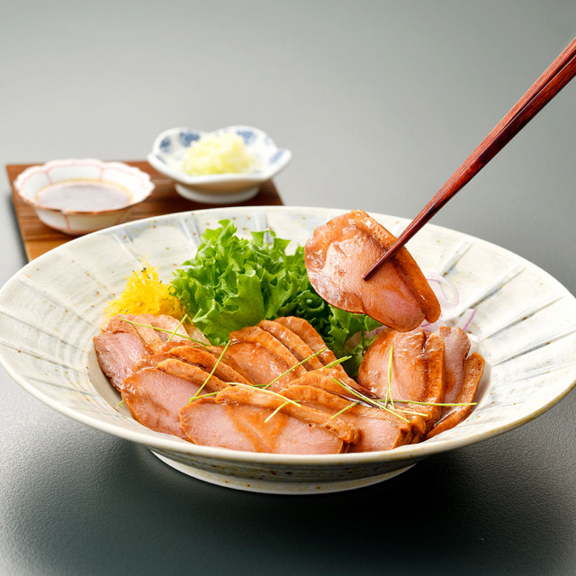 噛むほどに旨み感じるしっとりと柔らかい身は味わい深く、ご飯やお酒のお供にもおすすめです。お好みで「料亭の昆布とうがらし」を付けていただくと、また違ったびりっとした味わいに、「葱油」は香ばしい香りと風味をお愉しみいただけます。「料亭の合鴨ロース」をぜひご賞味ください。