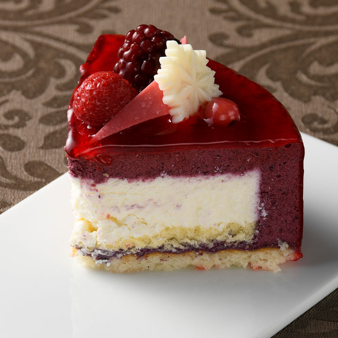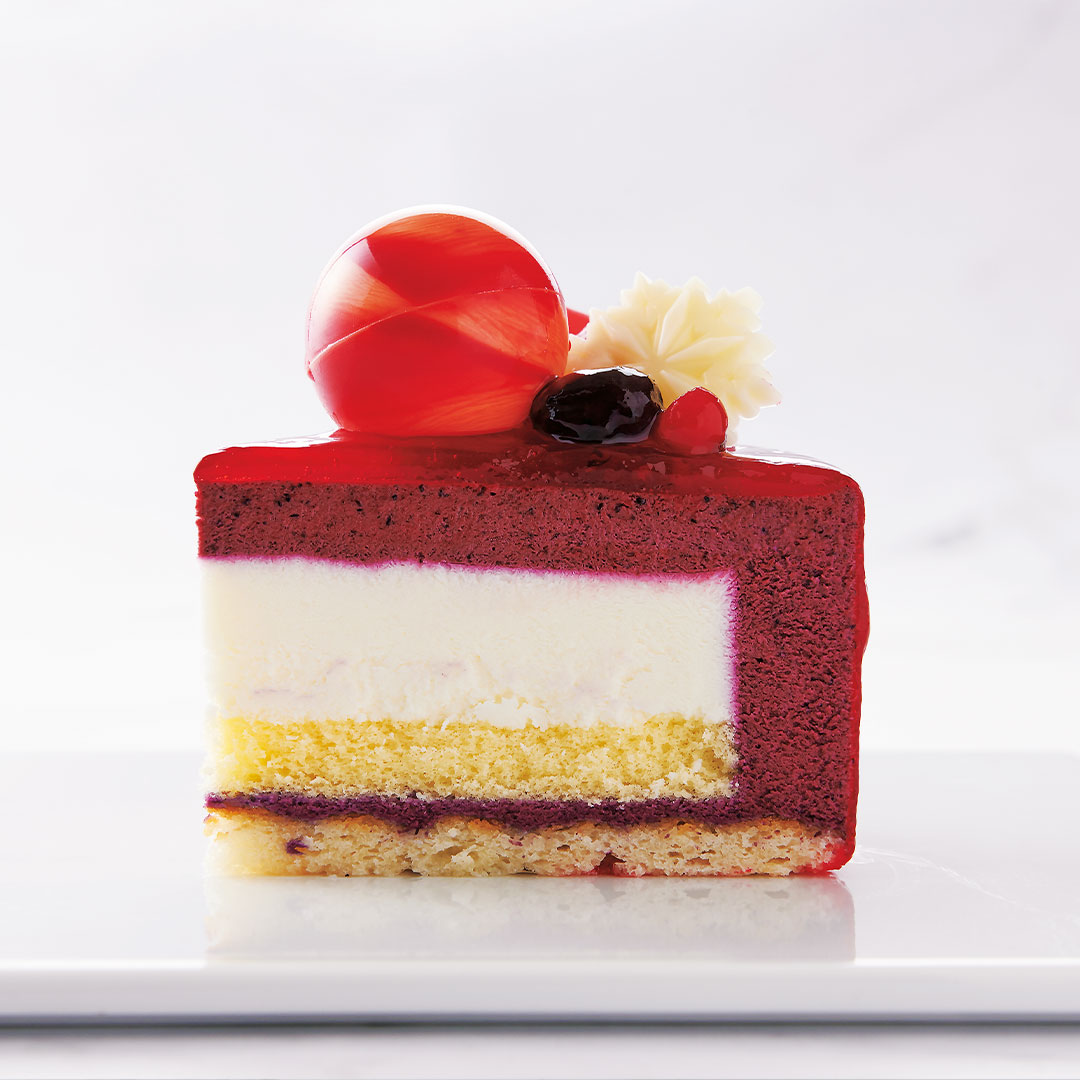 甘さ控えめのブルーベリームースにコクのあるフロマージュムースを合わせ、赤いグラサージュで華やかに仕上げました。飽きのこないやさしい味わいのケーキは、様々な年代の方にお楽しみいただけます。