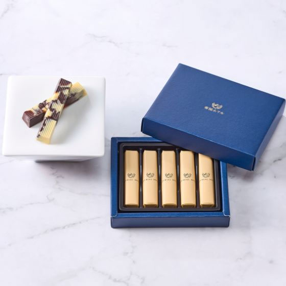 帝国ホテル2代目本館(通称「ライト館」)の外壁のスクラッチタイルを模した、スティック型のマーブルチョコレートです。美しい模様のマーブルチョコレートは、ほどよい厚みで歯応えが特徴で、 ホワイトチョコレートとビターチョコレート、それぞれの味わいが感じられます。