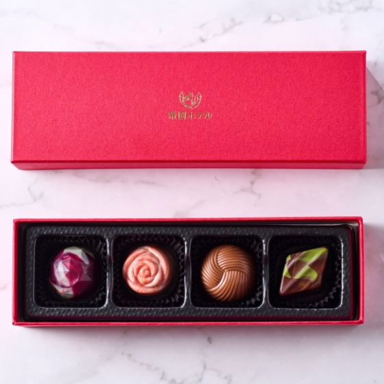 贈り物にぴったりな赤色のパッケージに、4種類のチョコレートを詰め合わせました。