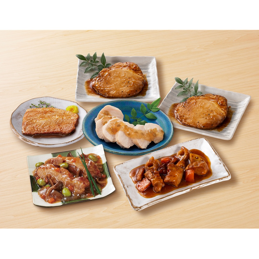 内容 | ●鶏肉と根菜の黒酢餡仕立て185g ●鶏肉と野菜の炊き合わせ150g ●豚ロースの醤油煮込み70g×2 ●豚ばらの味噌煮込み70g ●蒸し鶏の梅ジュレ仕立て150g |