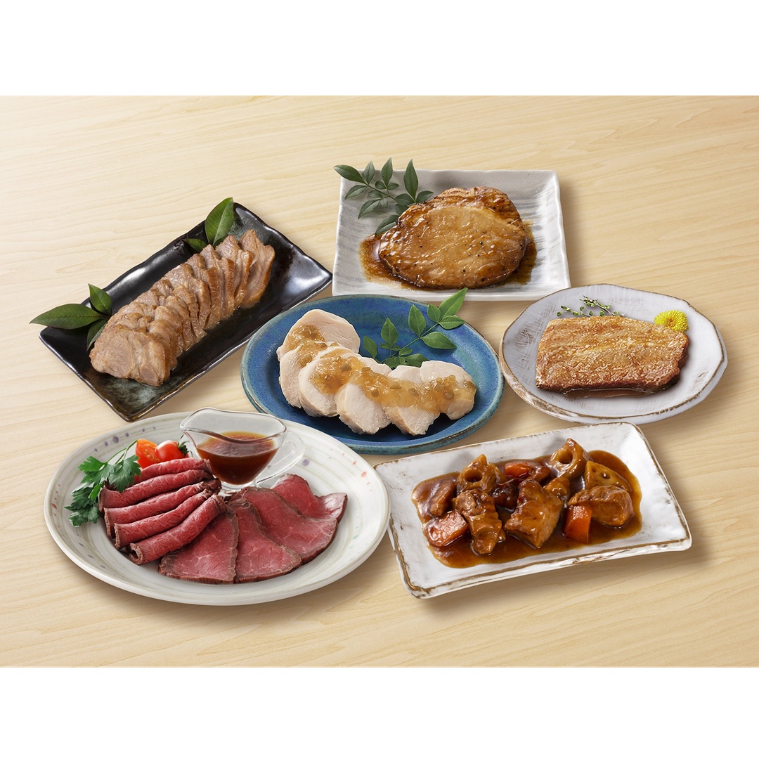 内容 | ●ローストビーフ210g(ソース60g) ●蒸し鶏の梅ジュレ仕立て150g ●豚ロースの醤油煮込み70g ●豚ばらの味噌煮込み70g ●香味叉焼180g ●鶏肉と根菜の黒酢餡仕立て185g |