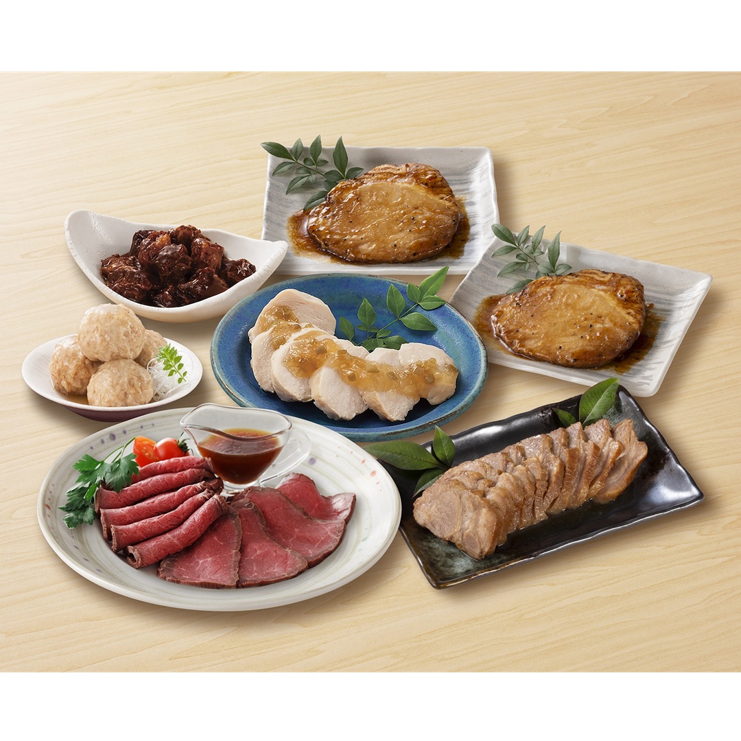 内容 | ●ローストビーフ210g(ソース60g) ●蒸し鶏の梅ジュレ仕立て150g ●牛とろとろ煮150g ●豚ロースの醤油煮込み70g×2 ●香味叉焼180g ●つくねの蕪みぞれ仕立て180g |