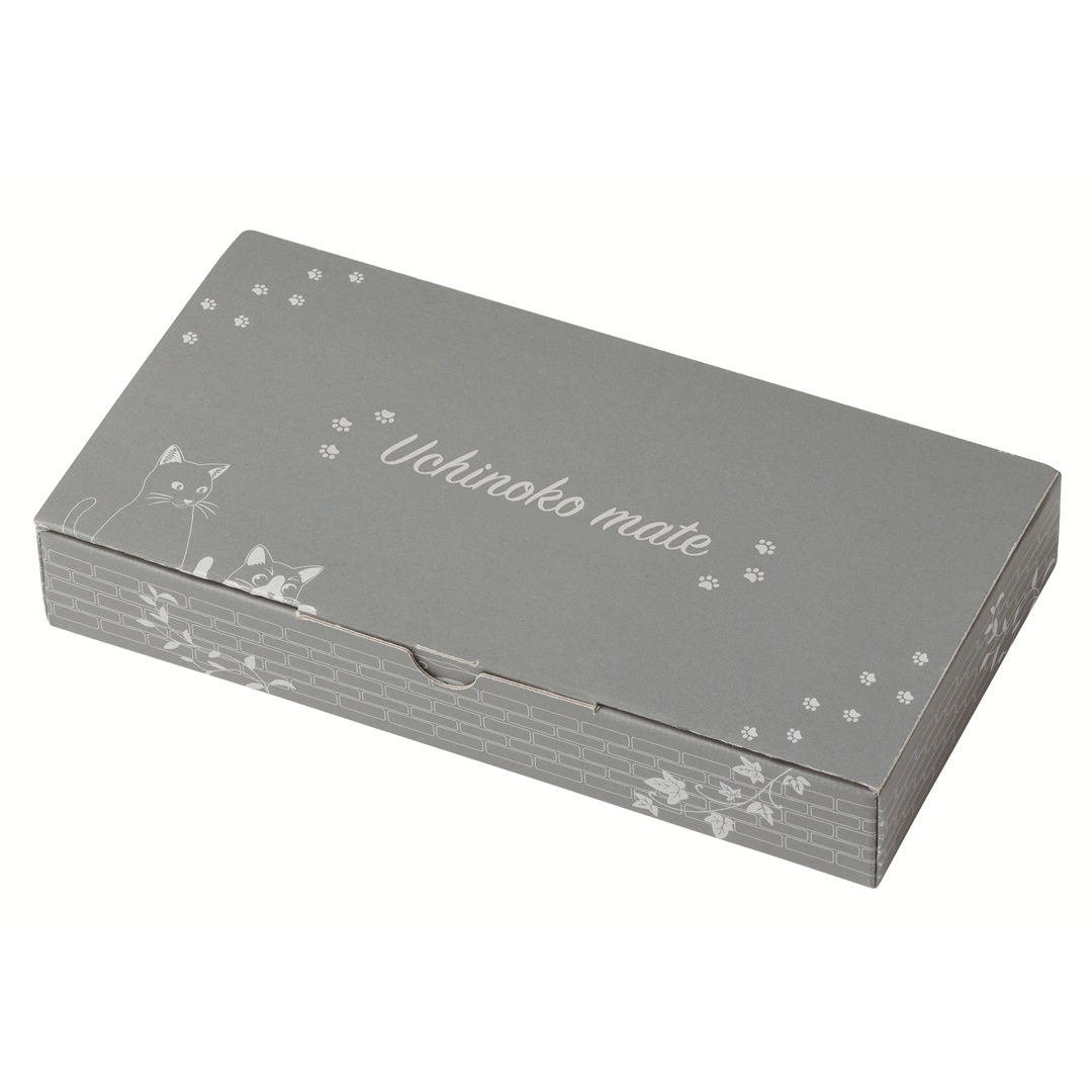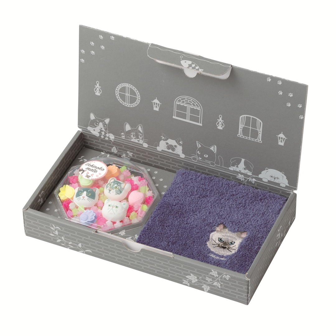 今治製でやわらかな触り心地のハンカチにはかわいいニャンコのワンポイント刺繍入。カラフルな金平糖と、猫や肉球の形のラムネがセットになりました。ラムネは、なんと和三盆糖入りの上品甘さで落雁のような製法で作ったこだわりのお菓子!