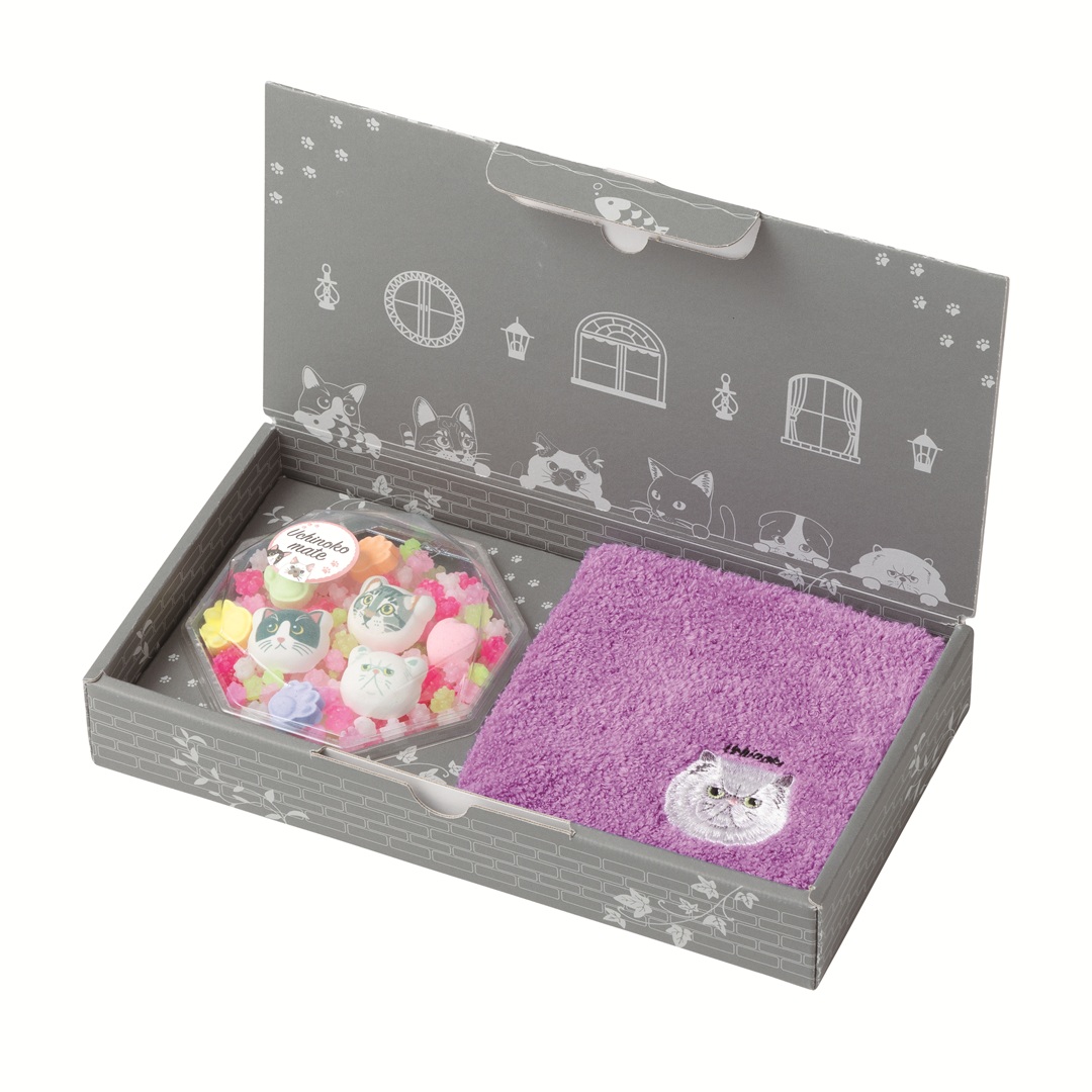 今治製でやわらかな触り心地のハンカチにはかわいいニャンコのワンポイント刺繍入。カラフルな金平糖と、猫や肉球の形のラムネがセットになりました。ラムネは、なんと和三盆糖入りの上品甘さで落雁のような製法で作ったこだわりのお菓子!