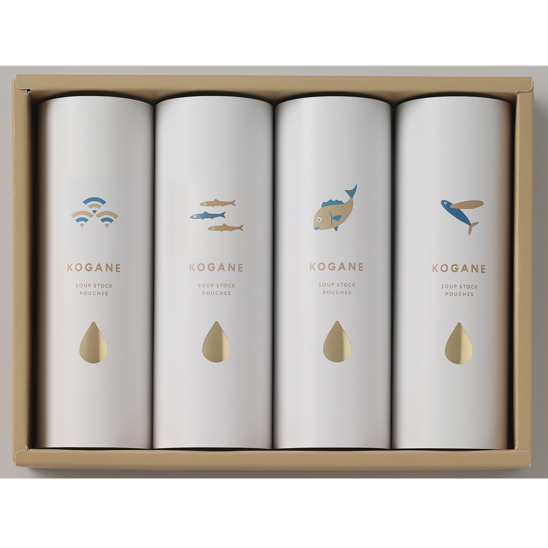 4種類の味をイメージできるデザインがほどこされた、エレガントな小箱の中に、それぞれのこだわりだしパックを詰め込みました。おしゃれに敏感な女性から特に褒められるデザイン。お祝いの場以外でも手土産や歓送迎などの贈り物に人気です。
