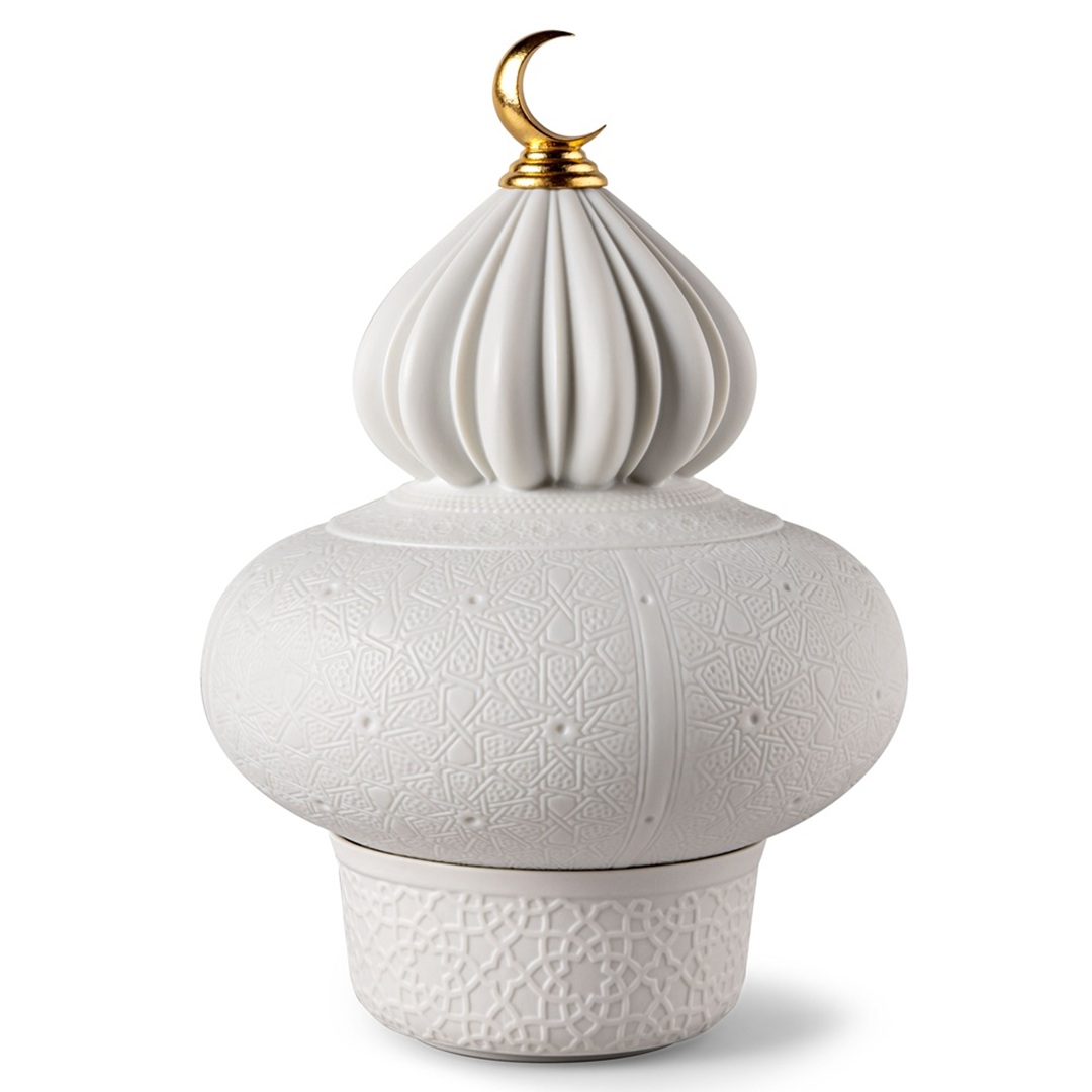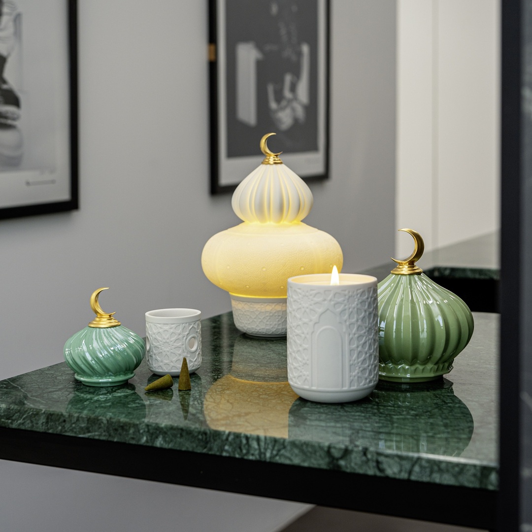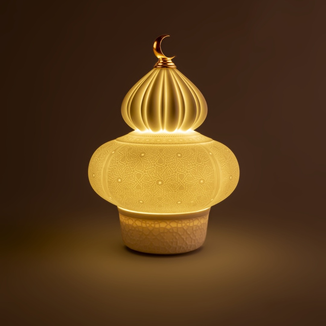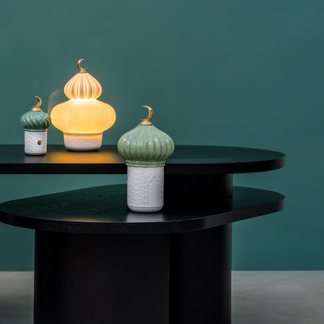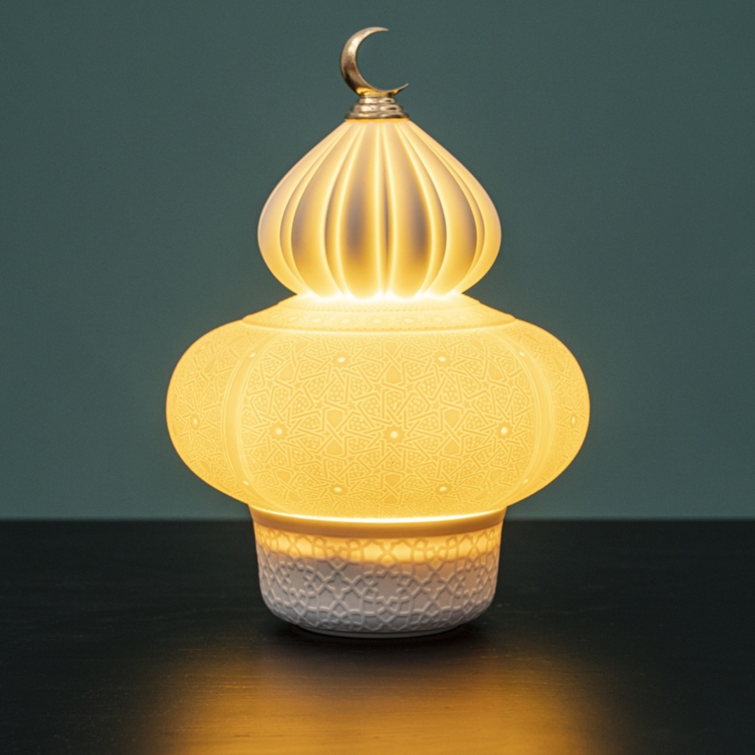 リヤドロのオーナメント・アーティスト・チームが手作業で丁寧にエッチングし、特徴的な格子模様が施されたワイヤレスランプ。ドーム型のシェードは、磁器の透光性により、光を通し、表面に彫られたデザインを映し出し、温かな輝きを放ちます。