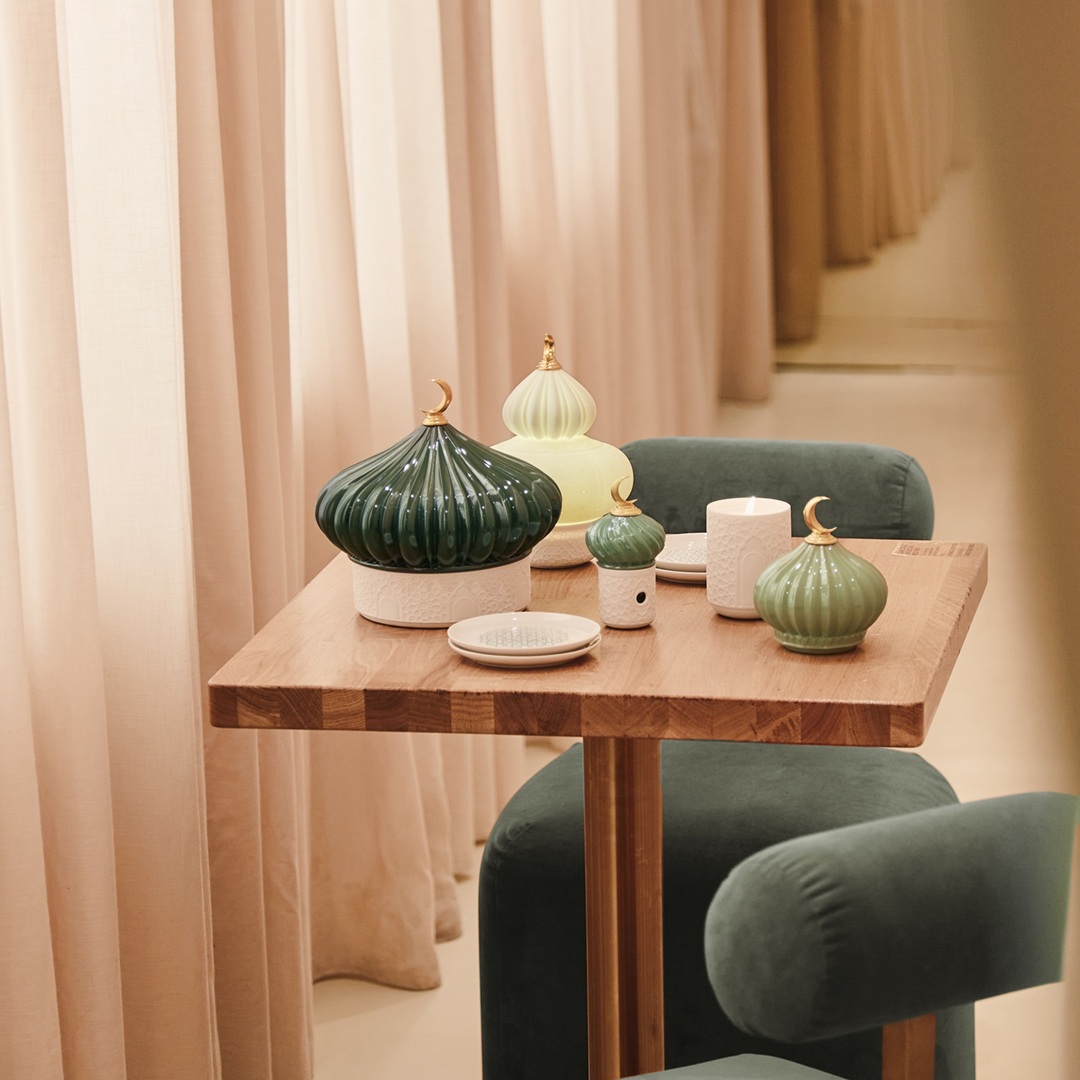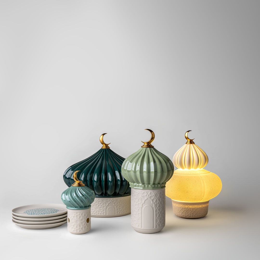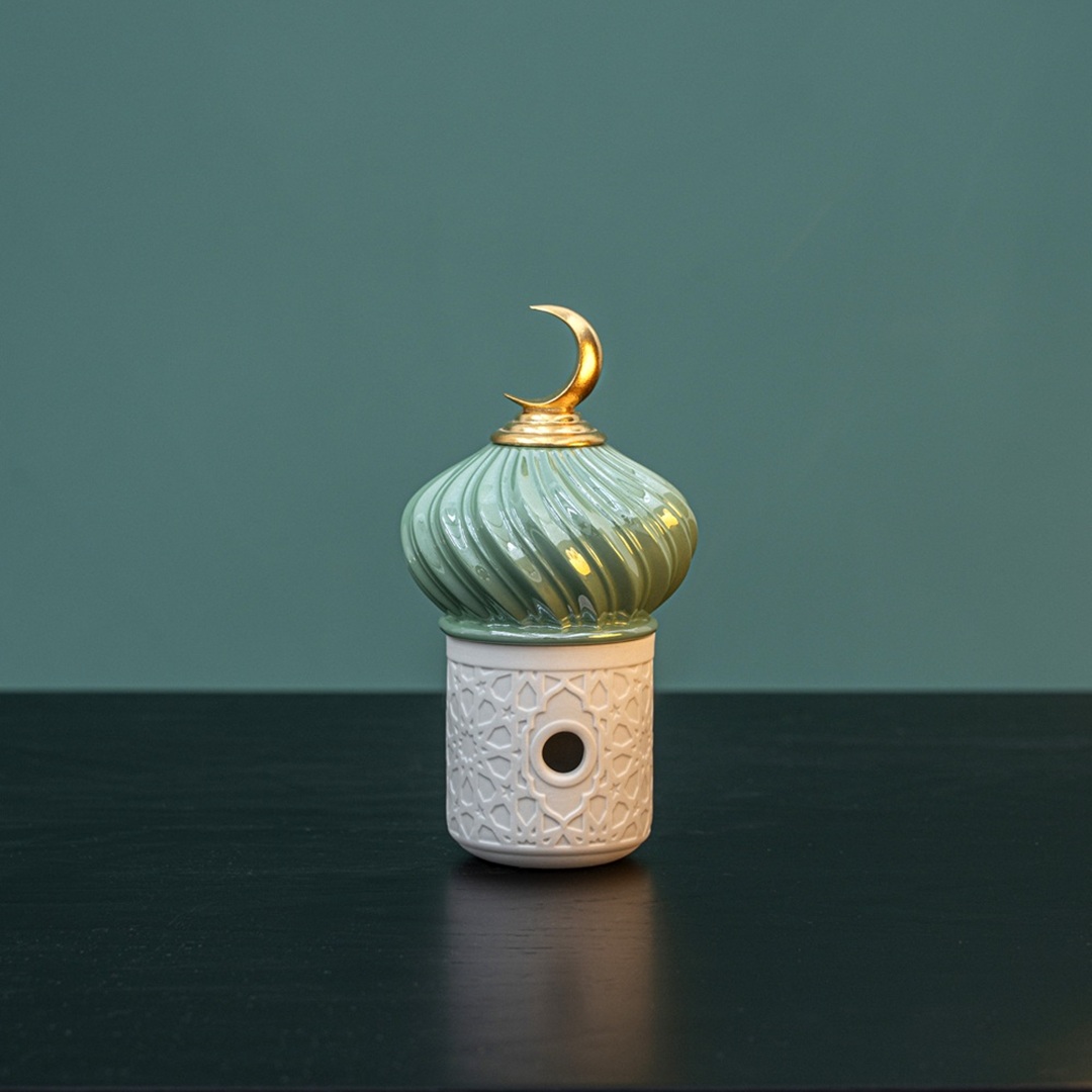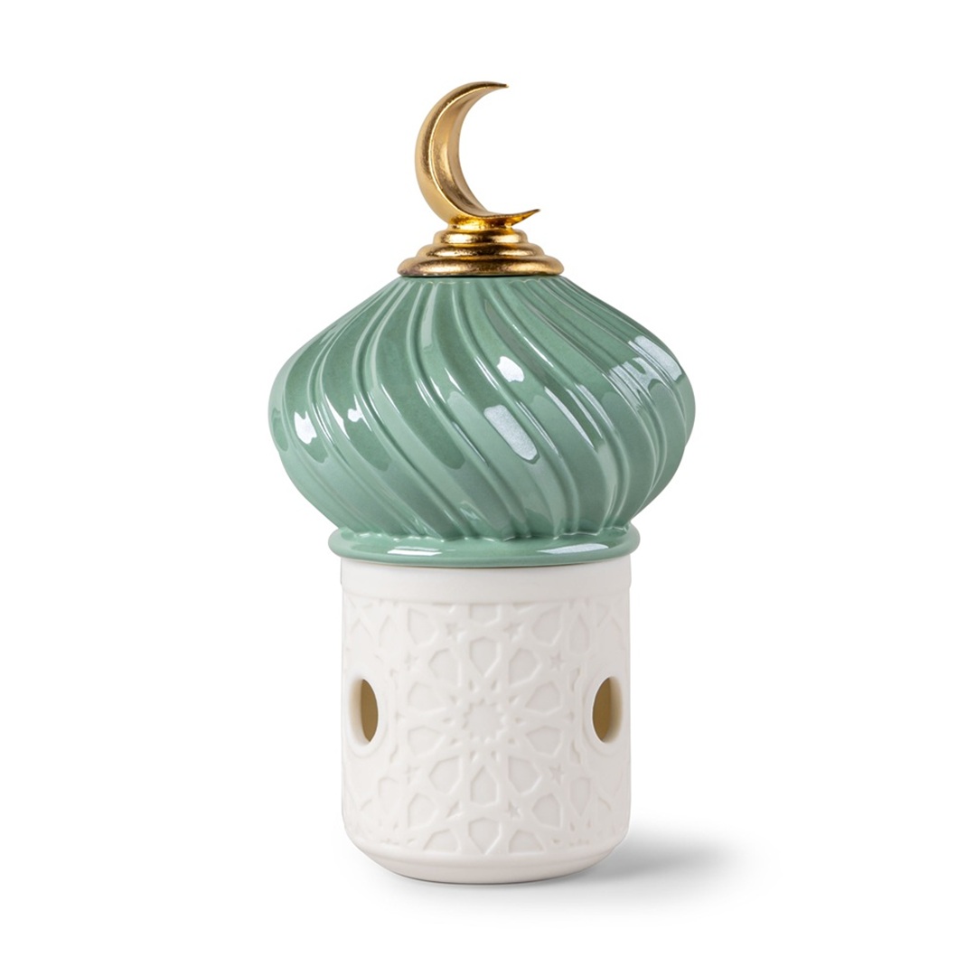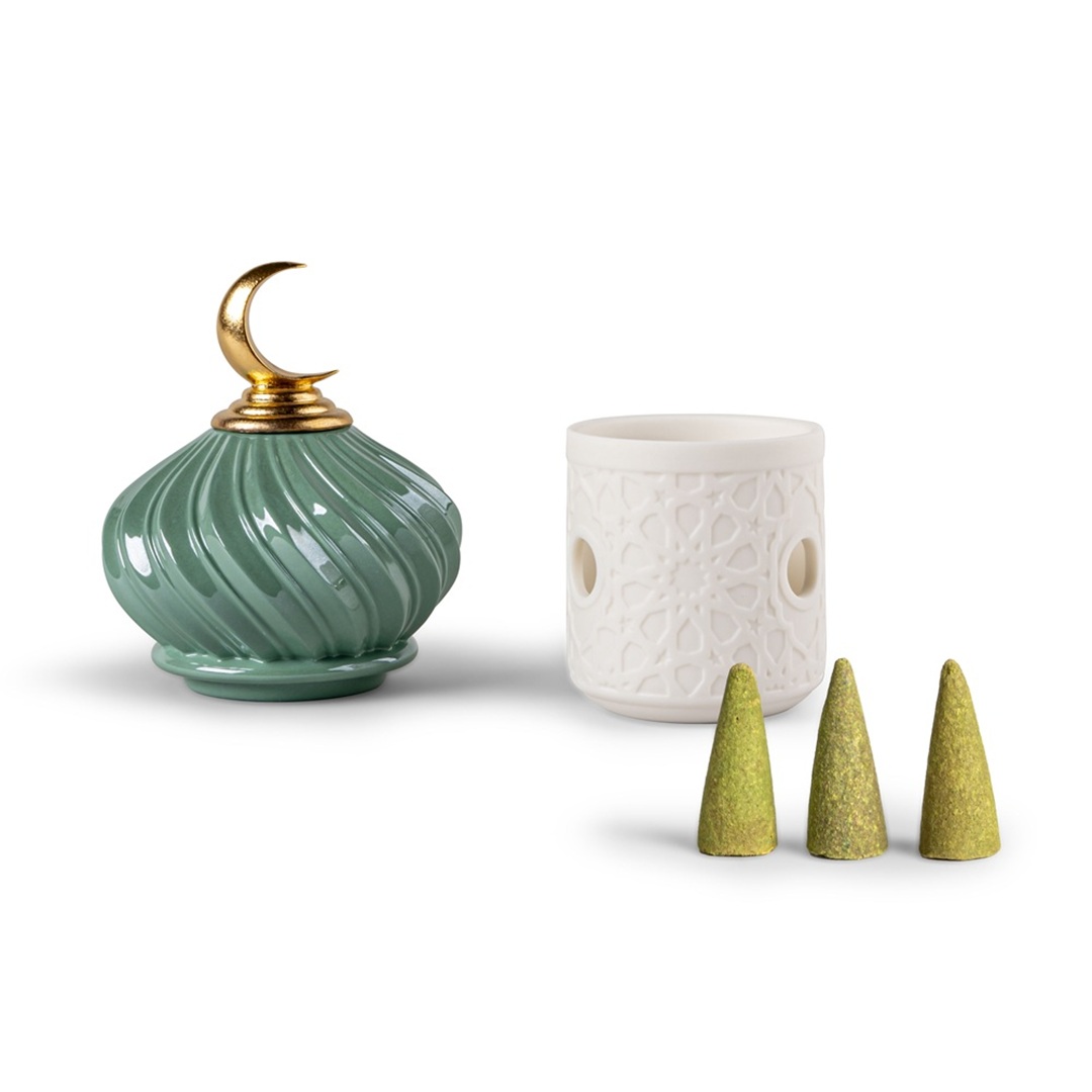 「MajesticNights」コレクションは、リヤドロのオーナメント・アーティスト・チームが手作業で丁寧にエッチングし、特徴的な格子模様で飾られています。ブルーグリーンのエナメル加工されたドームのトップには、輝くゴールドの三日月が冠されています。下部はマットな白磁です。インセンスコーン3個が付属します。