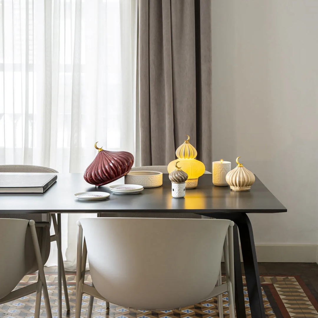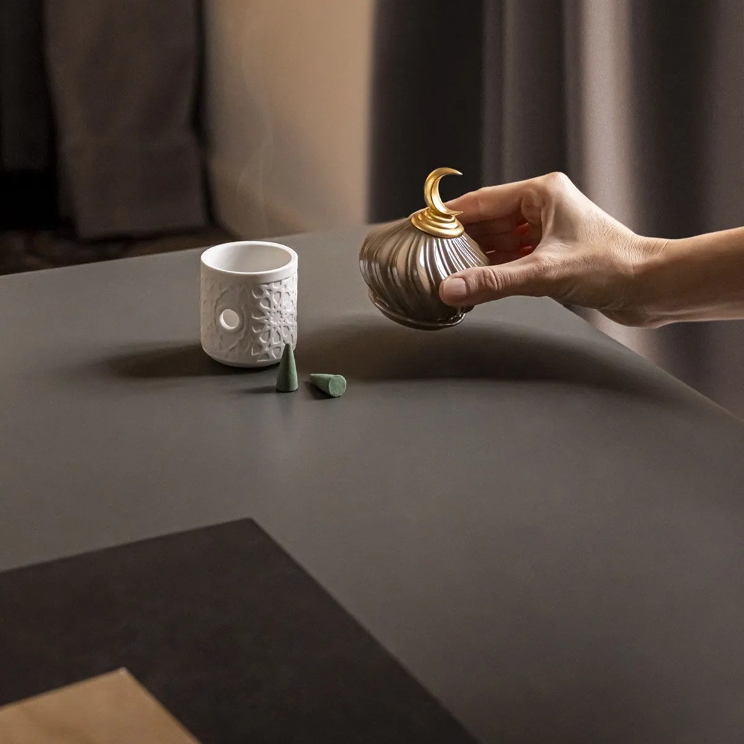 Majestic Nightsコレクションのインセンスディフューザーはポーセリンで手作りされており、幾何学模様とエレガントなライトブラウンの釉薬が刻まれています。インセンス・コーン3個付きで、どんな空間も静寂と瞑想のオアシスに変えてくれます。オリエンタルな香りを想起させる香り、古代の伝説にインスパイアされたフォルムなど、夢想、静寂、そしてファンタジーを思わせる作品です。