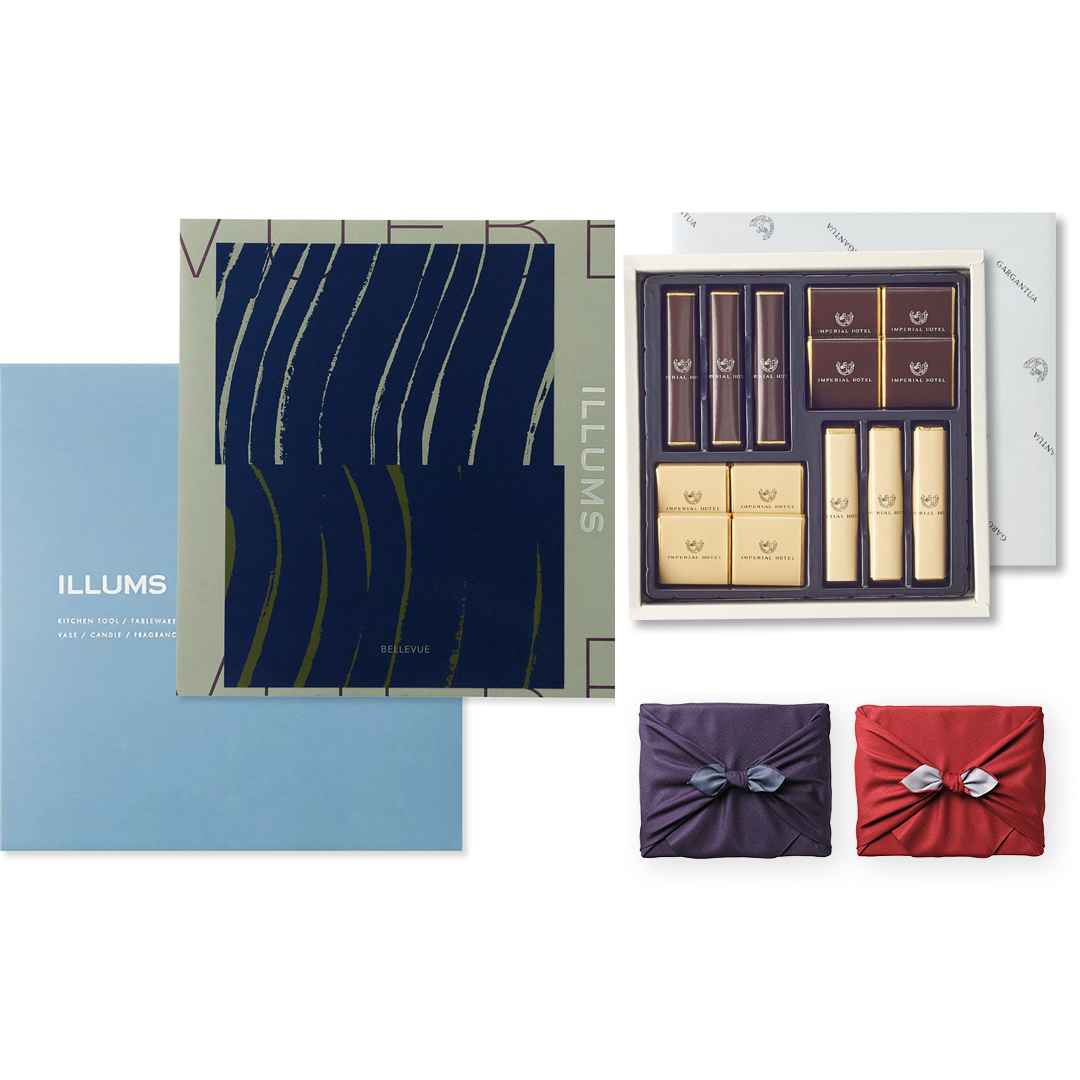 北欧ブランドを中心に、暮らしを豊かにする多彩なアイテムをセレクトした「ILLUMS(イルムス)ギフトカタログ」に、帝国ホテルのチョコレートを添えて、京都・風呂敷にお包みします。