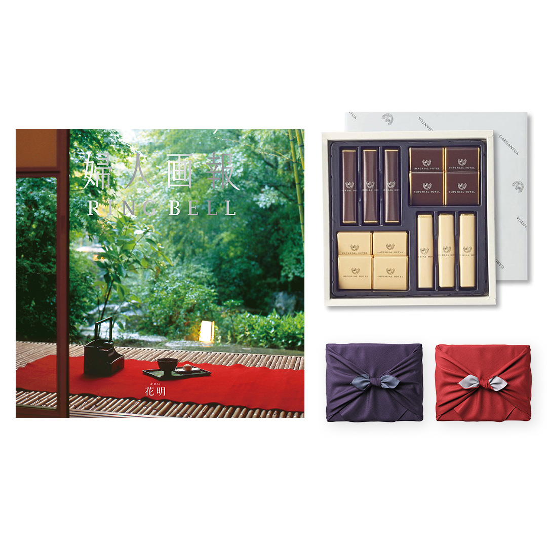 その中から特に優れた「モノ」や「グルメ」を、婦人画報編集部が再考したカタログギフトに、帝国ホテルのチョコレートを添えて、風呂敷にお包みします。