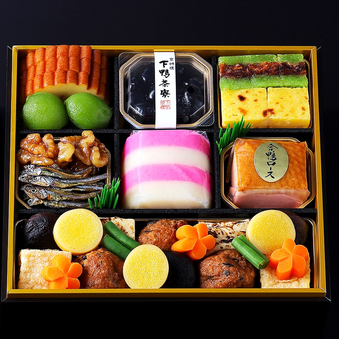 二の重には、合鴨ロース、飛龍頭煮など人気の下鴨茶寮の味をはじめ、定番の縁起ものを詰めました。大切な人と幸せを分かち合う瞬間に、下鴨茶寮のおせちが彩りを添えてくれますように。