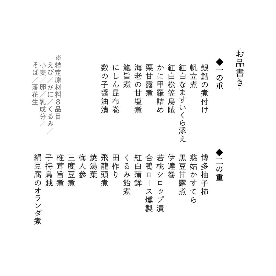 博多柚子柿、慈姑かすてら、黒豆甘露煮、伊達巻、若桃シロップ漬、合鴨ロース燻製、紅白蒲鉾、くるみ飴煮、田作り、飛龍頭煮、焼湯葉、梅人参、三度豆煮、椎茸旨煮、子持烏賊、絹豆腐のオランダ煮