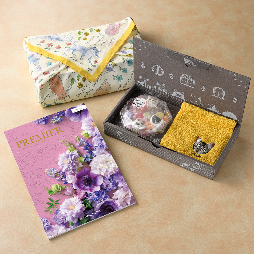 ネコ種を選べるハンカチとネコ柄の可愛いラムネなどのお菓子をカタログギフトとセットにしネコ柄の風呂敷でお包みします。