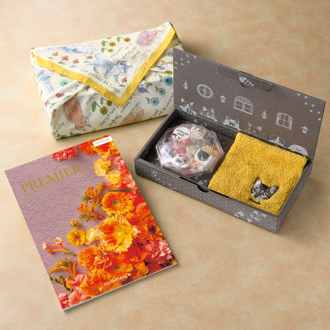 ネコ種を選べるハンカチとネコ柄の可愛いラムネなどのお菓子をカタログギフトとセットにしネコ柄の風呂敷でお包みします。
