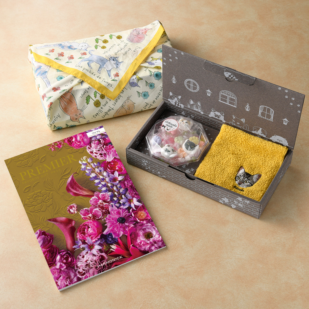 ネコ種を選べるハンカチとネコ柄の可愛いラムネなどのお菓子をカタログギフトとセットにしネコ柄の風呂敷でお包みします。