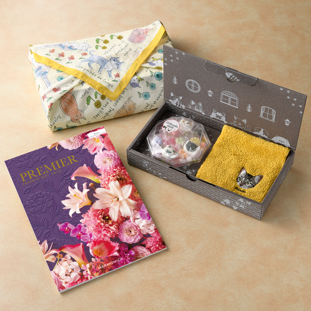 ネコ種を選べるハンカチとネコ柄の可愛いラムネなどのお菓子をカタログギフトとセットにしネコ柄の風呂敷でお包みします。