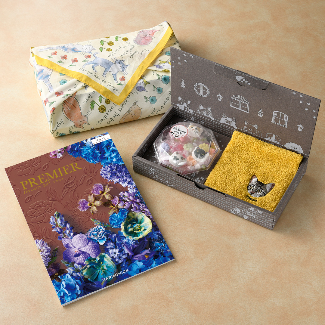 ネコ種を選べるハンカチとネコ柄の可愛いラムネなどのお菓子をカタログギフトとセットにしネコ柄の風呂敷でお包みします。