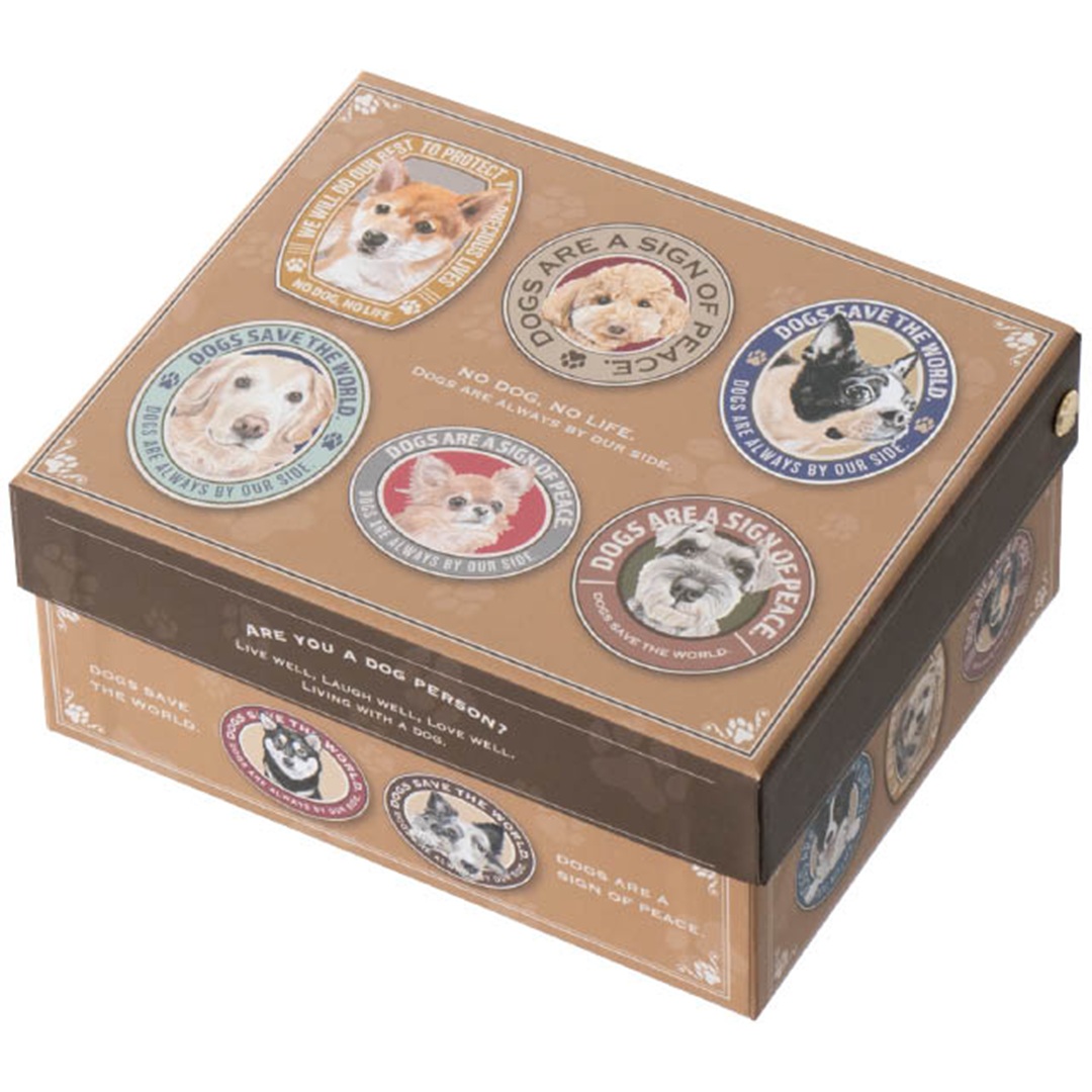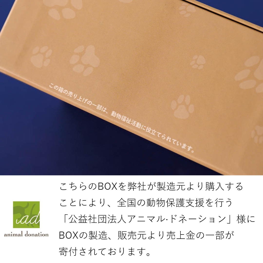 ボックスの表面だけでなく内側にもワンちゃんたちのイラスト入り!底面にもかわいい肉球がデザインされています。こちらのBOXを弊社が製造元より購入することにより、全国の動物保護支援を行う「公益社団法人アニマル·ドネーション」様にBOXの製造、販売元より売上金の一部が寄付されております。