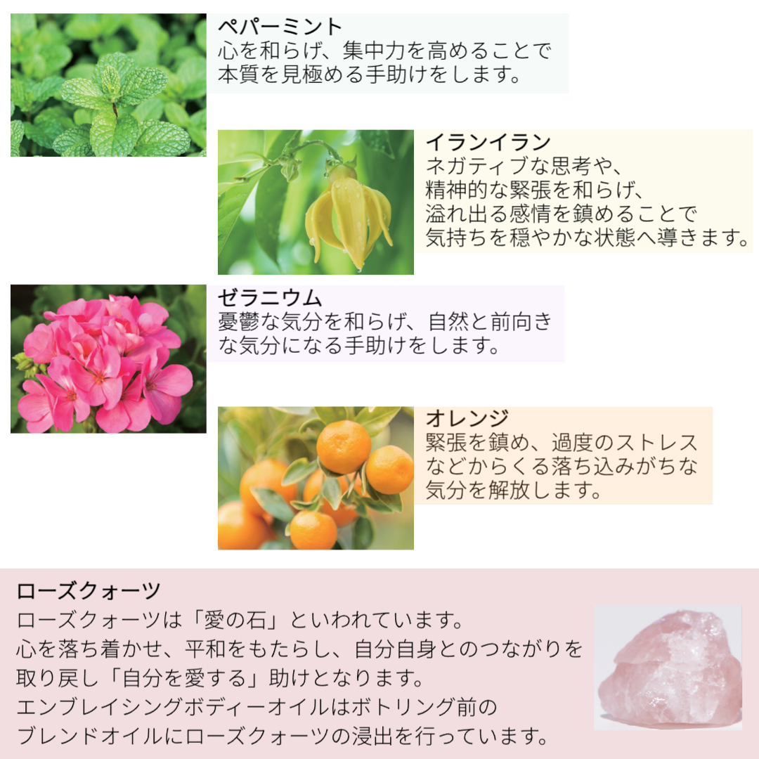 エンブレイシングボディーオイルは、心穏やかに自分と向き合うことで育まれる、自信や自己愛をサポートする香りです。