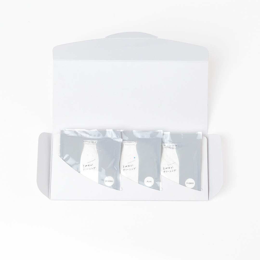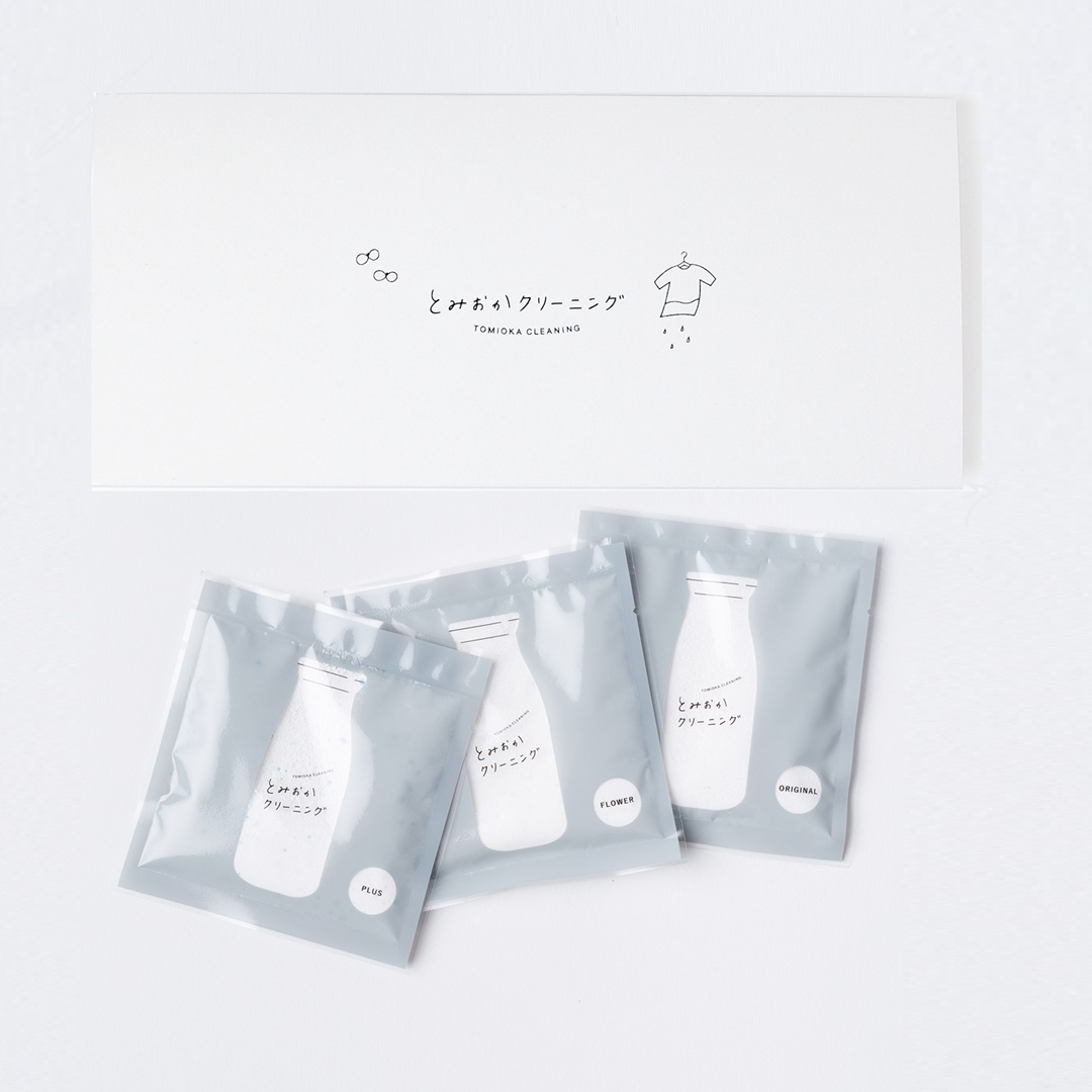 とみおかクリーニングの人気商品・粉末洗濯洗剤。この洗剤の小分けタイプ3種類を箔押しギフトパッケージに詰めました。プチギフトやノベルティにおすすめです。
